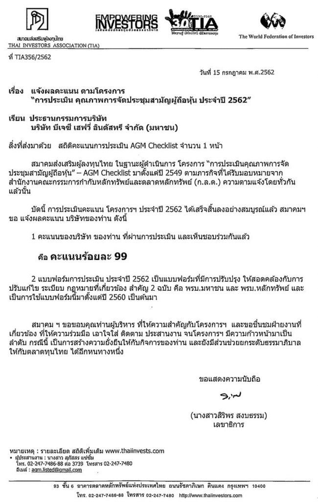 In AGM 2019, the Company received the full assessment score at 99 of 100, considered as the excellent level under quality assessment by Thai Investors Association (TIA) for the arrangement of its 2019 Annual General Meeting of the Shareholders. This is another success to prove that the Company has continued to give importance to and focus on continuous development of corporate governance.